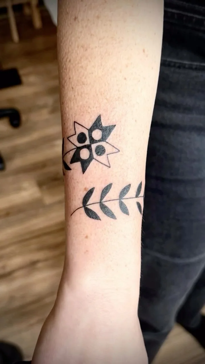 I began tattooing in 2020. I draw inspiration from ancient designs and bold folk art. Beyond the studio, I am a lover of antique shops, a painter of murals, and a touring musician. To recharge I like to travel and find adventures with my son and partner.